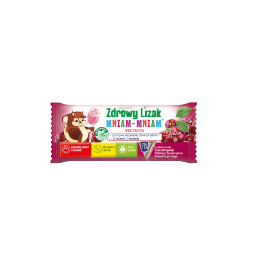 Zdrowy Lizak Mniam-Mniam o smaku musującej wiśni w kształcie łezki to produkt będący wspaniałą alternatywą dla lizaków pełnych cukru dostępnych na sklepowych półkach. Zamiast cukru zawiera on fiński ksylitol, który wykazuje działanie przeciwpróchnicze oraz został wzbogacony w 12 witamin (A, C, D, E, B1, B2, B3, B5, B6, B7, B9, B12) oraz minerały (cynk, selen), dzięki czemu korzystnie wpływa na koncentrację i odporność. Produkt ten jest niskokaloryczny, bo ma tylko 15 kcal, a zawartość glikozydów stewiolowych sprawia, że ma wyjątkowo niski indeks glikemiczny. Lizak posiada akceptację Polskiego Towarzystwa Stomatologicznego.